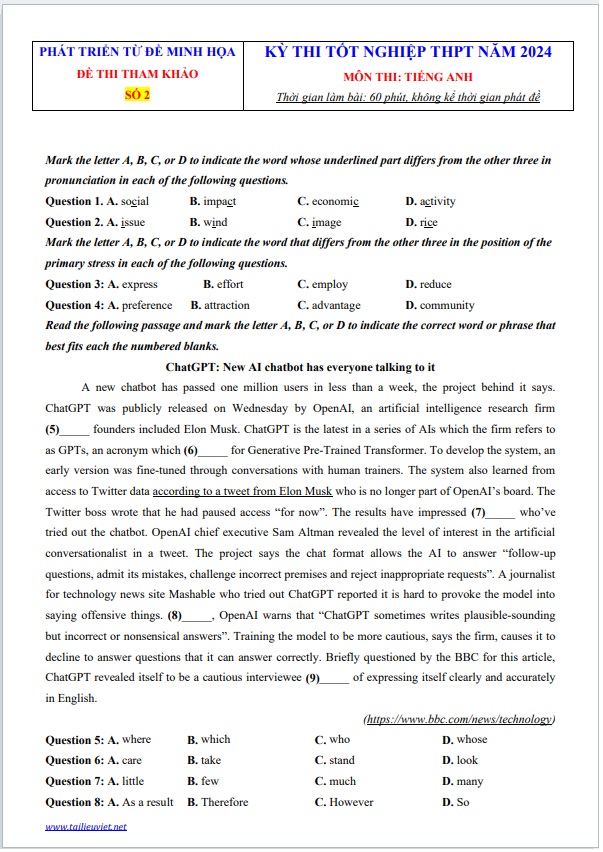 Chúng tôi sưu tầm, tổng hợp và gửi đến các bạn học sinh, quý Thầy, Cô Đề ôn thi số 2 phát triển từ đề minh họa Môn Tiếng Anh TN THPT năm 2024 của Bộ GD&ĐT có giải chi tiết. Tài liệu cũng có thể phục vụ quý Thầy, Cô trong công tác giảng dạy của mình.