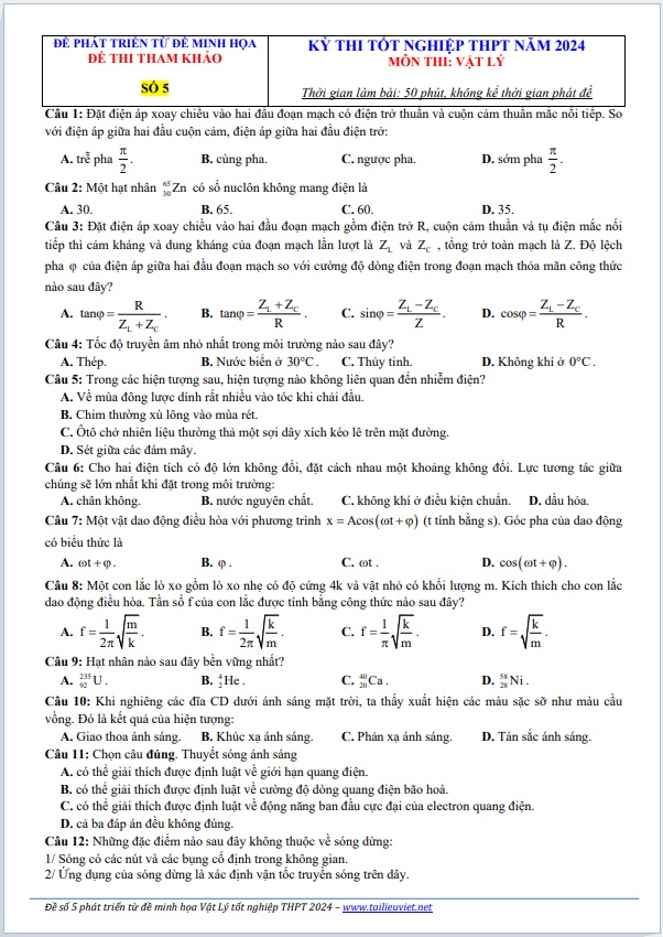 1.Tài liệu 1: ĐỀ SỐ 5 PHÁT TRIỂN TỪ ĐỀ MINH HỌA MÔN VẬT LÝ THI TỐT NGHIỆP THPT 2024 + GIẢI ĐÁP ÁN (FILE WORD + PDF)