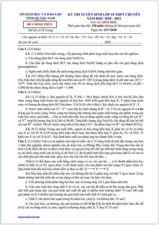 Chúng tôi sưu tầm, tổng hợp và gửi đến các bạn học sinh, quý Thầy, Cô Đề thi tuyển sinh vào lớp 10 trường chuyên môn Hóa Học năm 2020 – 2021 có đáp án. Tài liệu cũng có thể phục vụ quý Thầy, Cô trong công tác giảng dạy của mình.